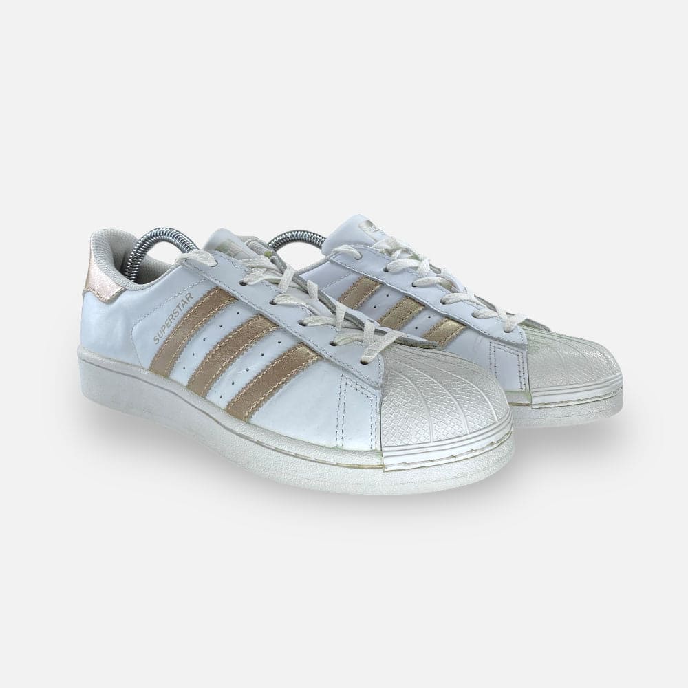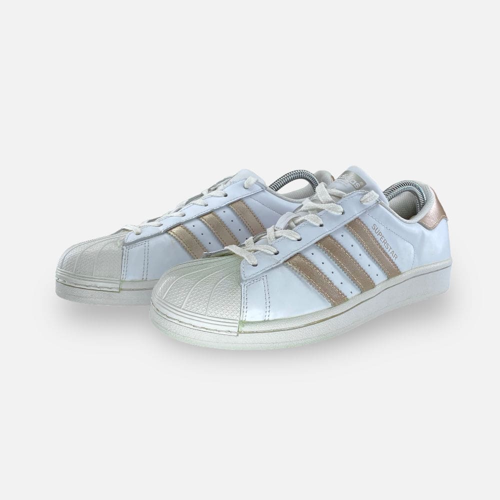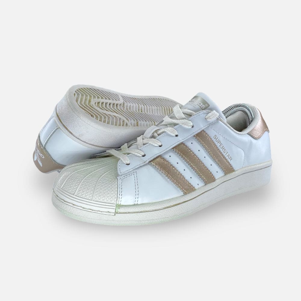 Deze tweedehands adidas Superstar Wit/Koper Dames - Maat 39.5 is volledig refurbished. Hij is volledig schoongemaakt en voorzien van een nieuw WEAR binnenzooltje.