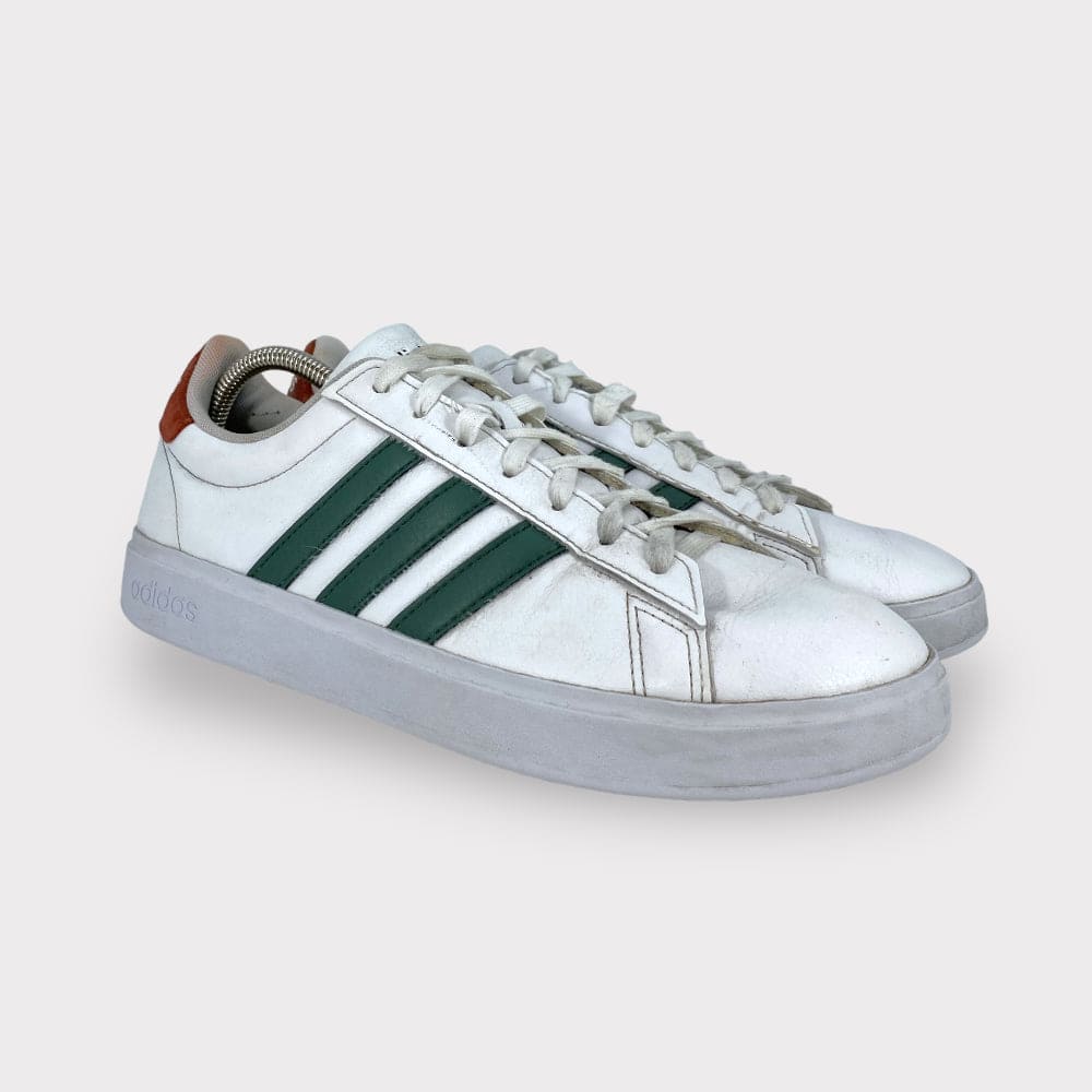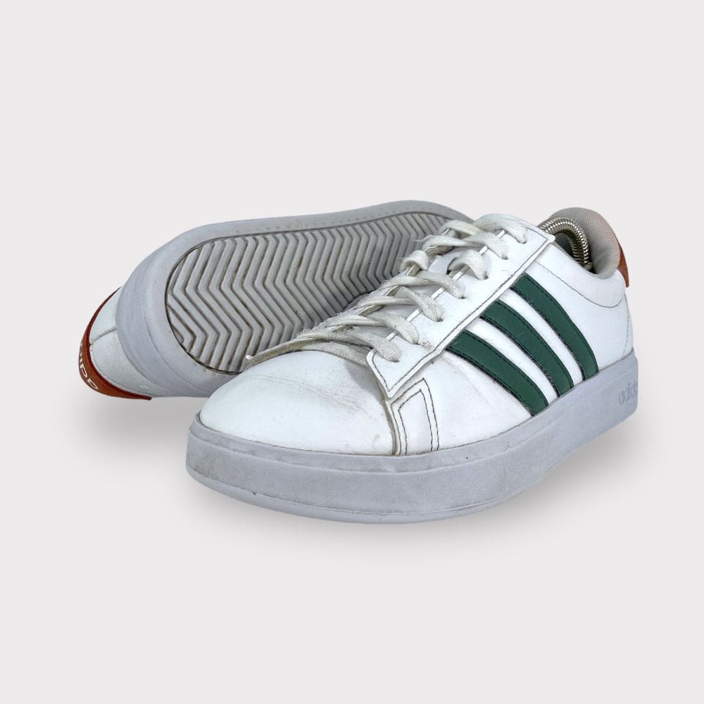 Deze tweedehands Adidas Grand Court 2.0 White - Maat 42.5 is volledig refurbished. Hij is volledig schoongemaakt en voorzien van een nieuw WEAR binnenzooltje.