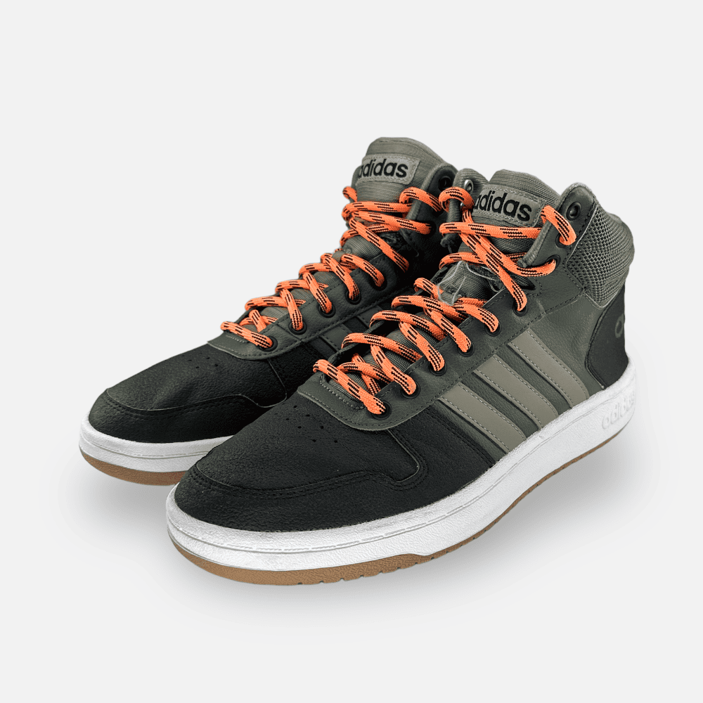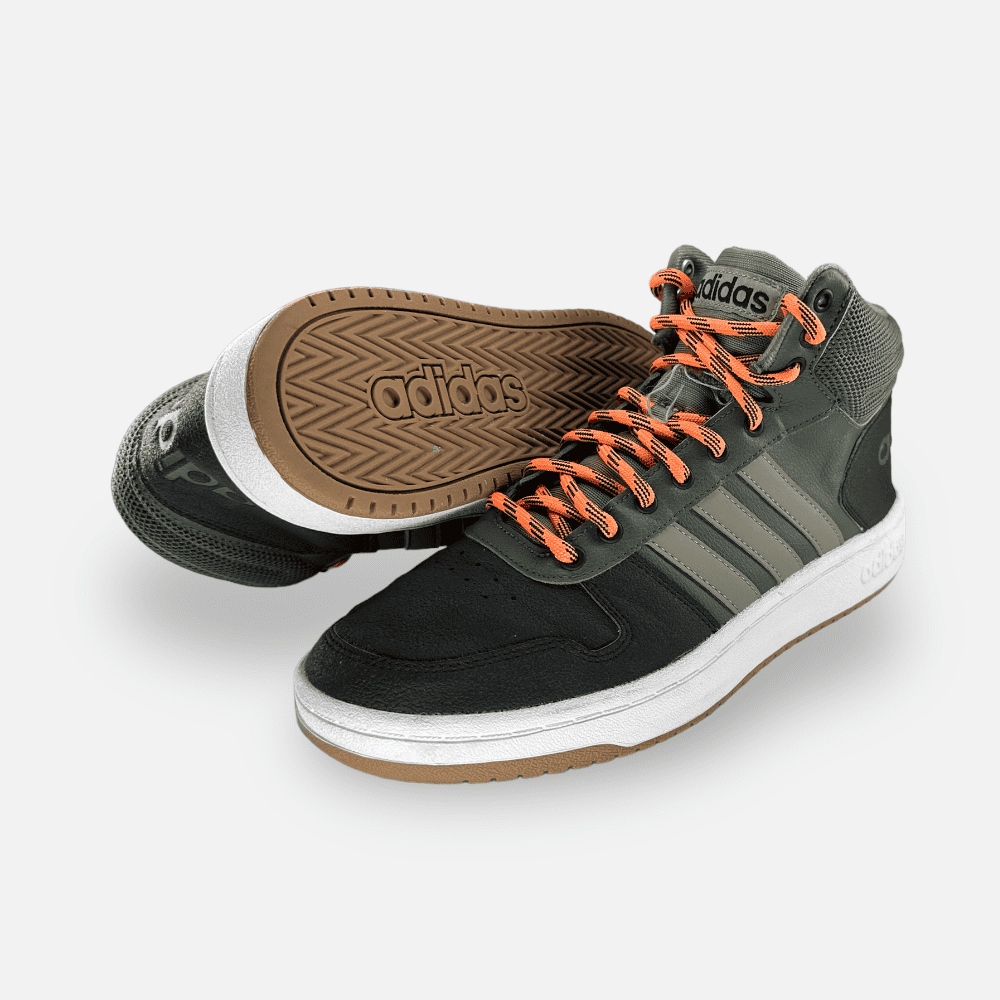 Deze tweedehands ADIDAS HOOPS 2.0 MID - Maat 42 is volledig refurbished. Hij is volledig schoongemaakt en voorzien van een nieuw WEAR binnenzooltje.