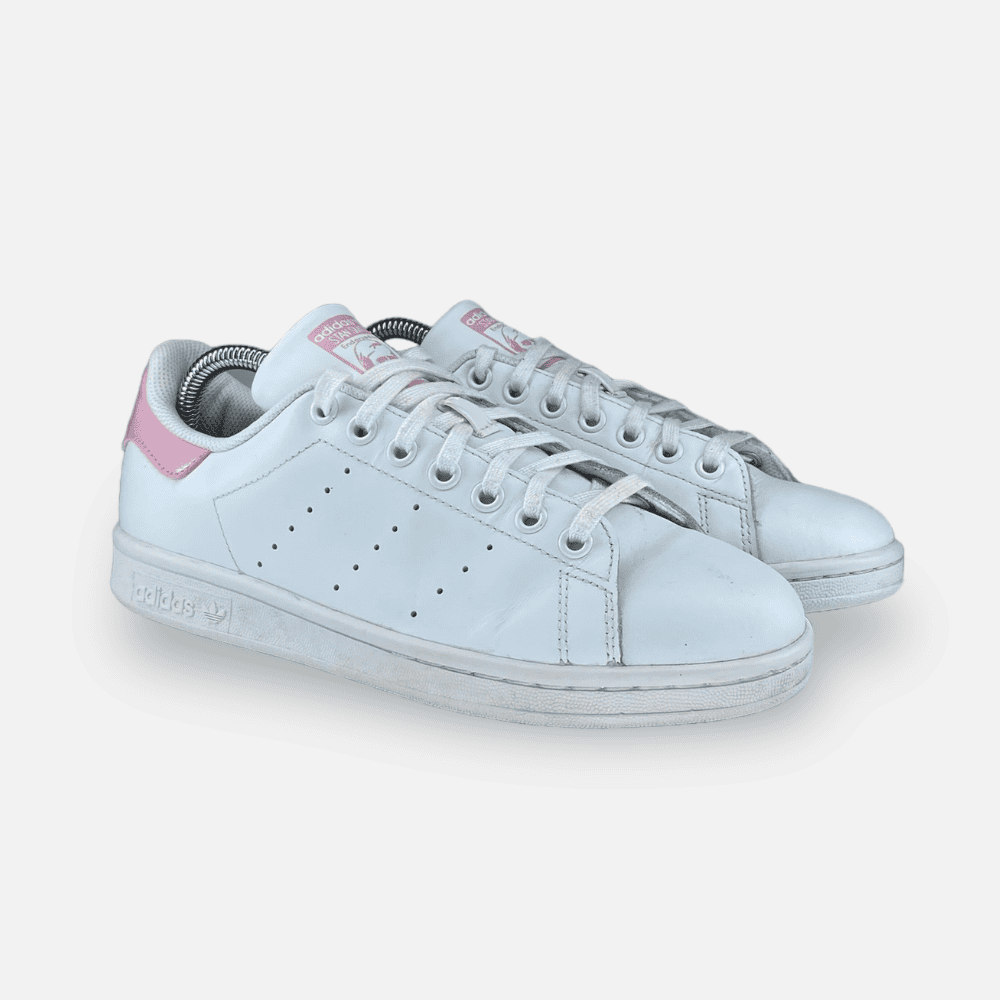 Deze tweedehands Adidas Stan Smith J - Maat 38.5 is volledig refurbished. Hij is volledig schoongemaakt en voorzien van een nieuw WEAR binnenzooltje.