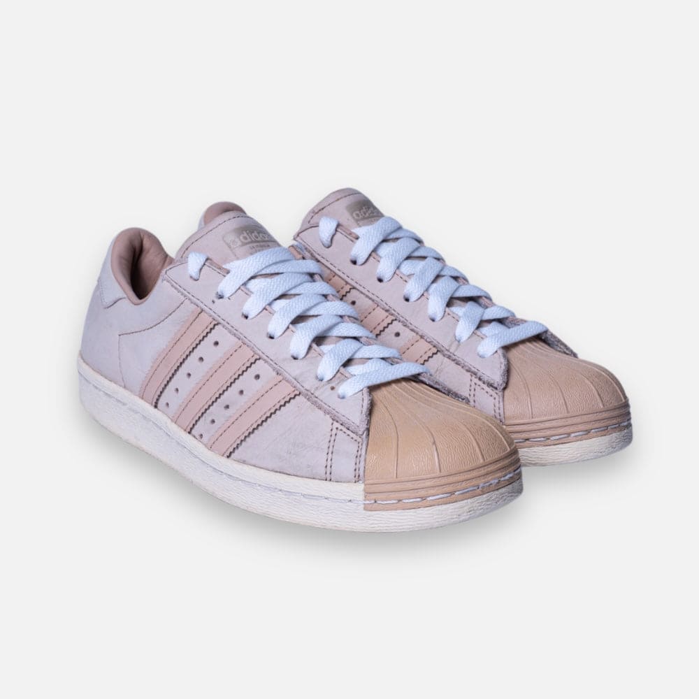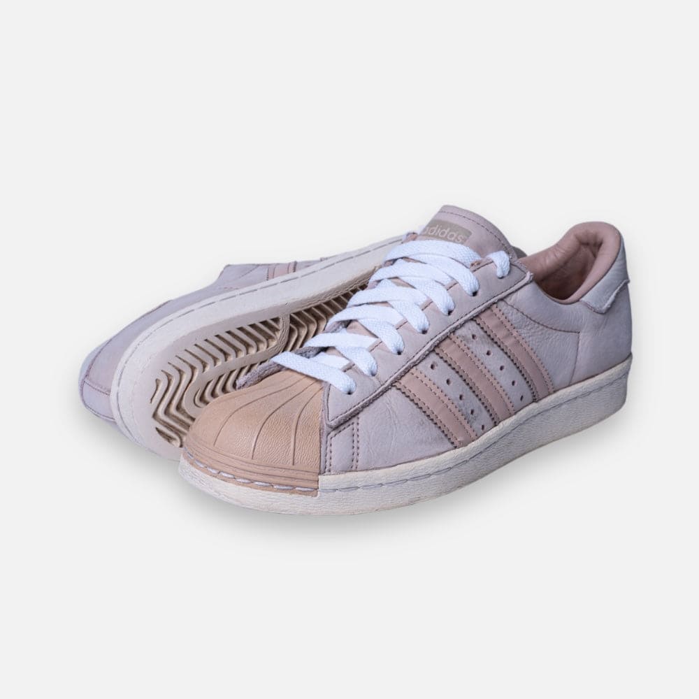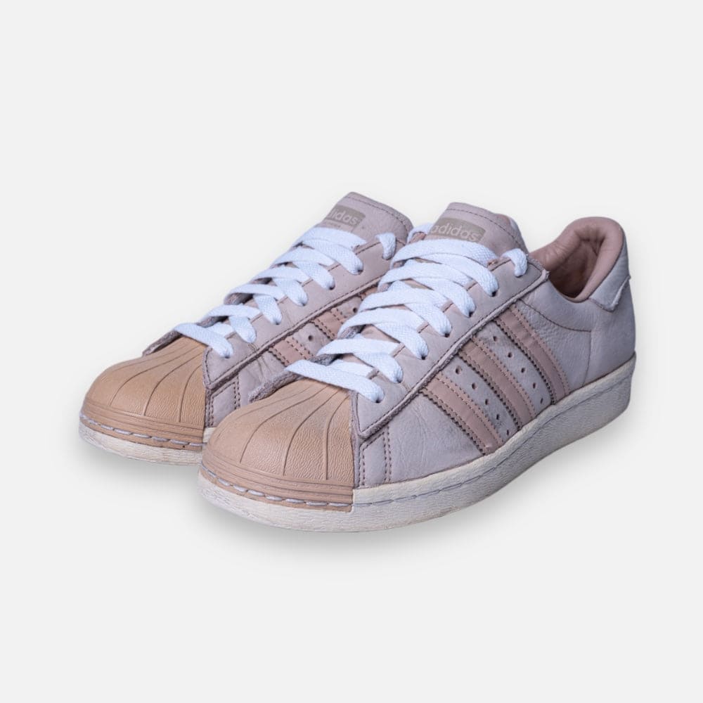 Deze tweedehands Adidas Superstar 80s - Maat 39.5 is volledig refurbished. Hij is volledig schoongemaakt en voorzien van een nieuw WEAR binnenzooltje.