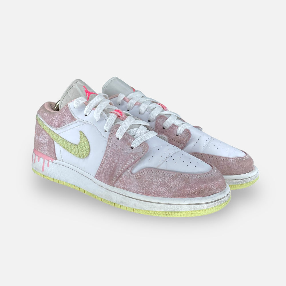 Deze tweedehands Air Jordan 1 Low GS 'Paint Drip' - Maat 40 is volledig refurbished. Hij is volledig schoongemaakt en voorzien van een nieuw WEAR binnenzooltje.